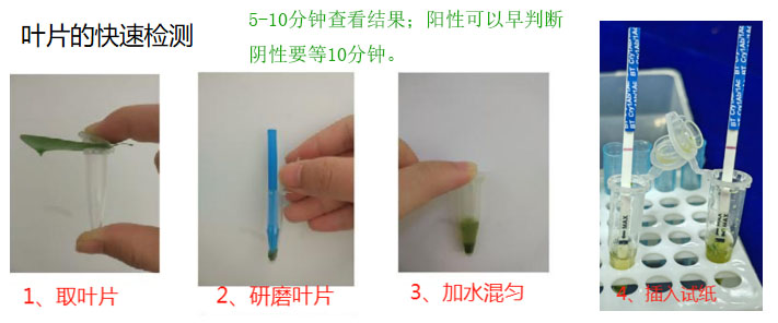 检测方法:组培苗或地苗,叶片粉碎加水,插入试纸,5-10分钟,出定性检测结果。性能稳定,结果准确可靠。